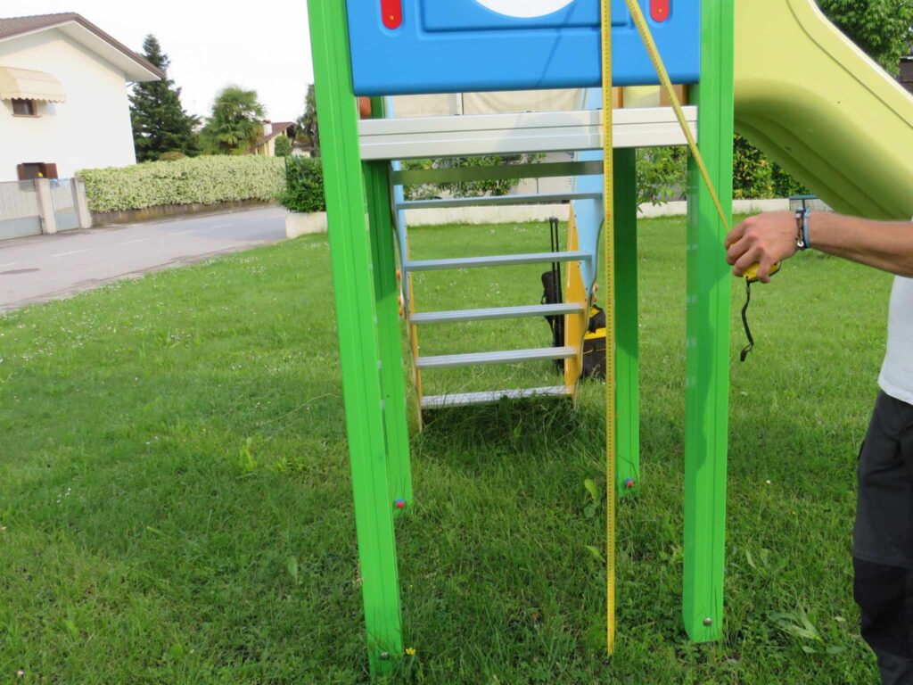 Oltre la verifica dell’area gioco, vengono controllate in sequenza su ogni attrezzatura; le parti strutturali, gli intrappolamenti, le dimensioni dei componenti, le altezze di caduta, gli spazi di caduta e le pavimentazioni. antitrauma.